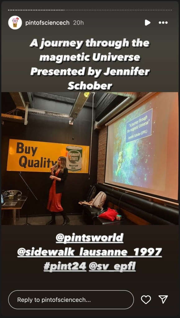 Public talk entitled “A journey through the magnetic Universe” at a “Pint of Science” event (Lausanne, Switzerland, 2024):